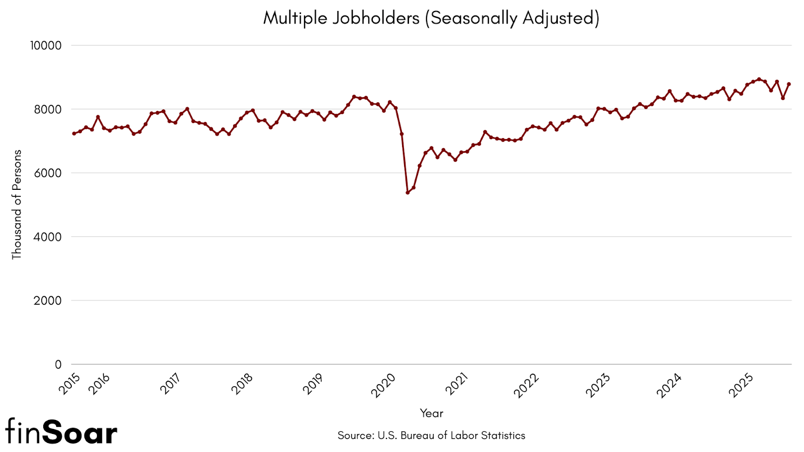 A staggering 8.9 million Americans now work multiple jobs — the highest number since tracking began in 1994. That's 5.4% of all employed workers, a rate not seen since the Great Recession.