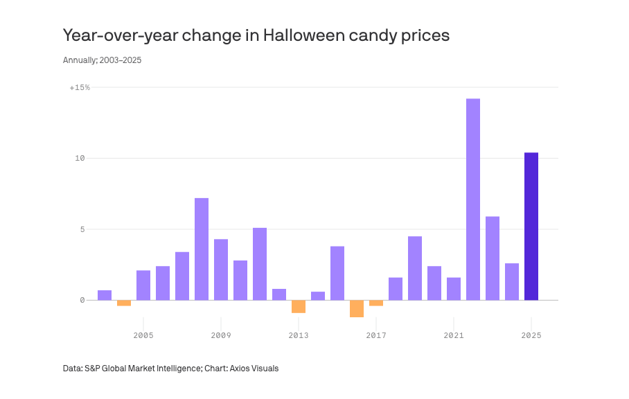 Analysts estimate candy prices are up about 10% this Halloween season, with chocolate-based treats up 20% in some cases as climate-driven supply tightness meets policy-driven import costs.