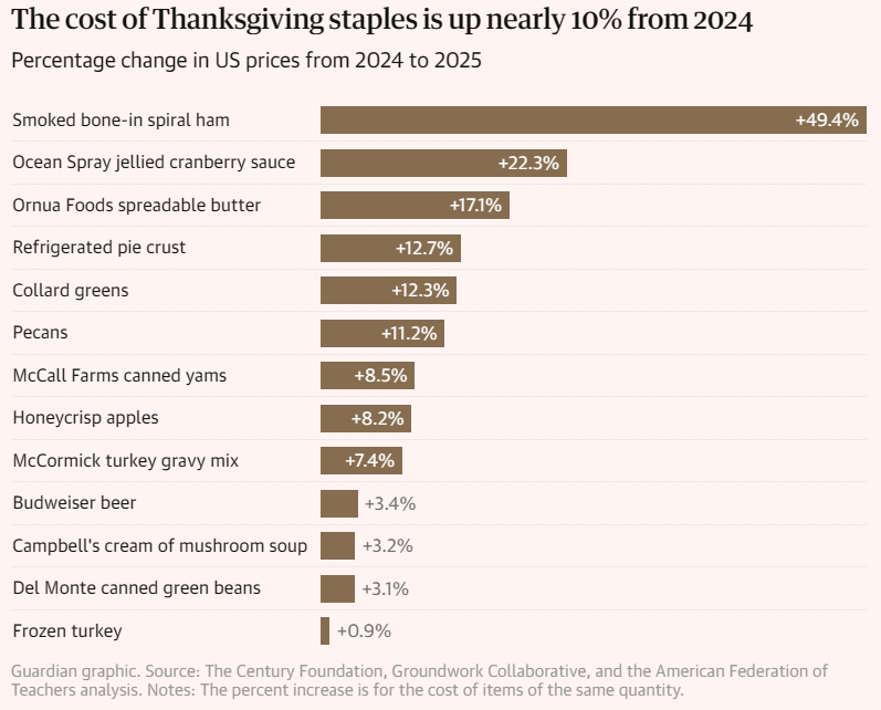 Welcome to the Thanksgiving food cost wars, where everyone is using different numbers, and Americans are left wondering what anything actually costs. The American Farm Bureau Federation says Thanksgiving dinner for 10 people declined 5% this year to $5.52 per person, the third consecutive year of decreases. Wells Fargo pegs the drop at 2% to 3%. But analysis found prices are nearly 10% higher, particularly for name brands. The confusion stems from what you put in your basket and where you shop. Aluminum products got crushed by tariffs. Canned cranberry sauce is up 22%, creamed corn up 21%, Reynolds Wrap heavy-duty aluminum foil up 40%. Turkey prices tell two completely different stories. Wholesale prices jumped 75% from last year to more than $1.70 per pound, according to USDA data cited by Purdue University. Bird flu culled more than 2 million turkeys this year. But retail turkey prices? Holding steady or even falling. Stores are eating the increased costs as "loss leaders" to get customers through the door. "Retailers use turkeys as a loss leader," said David Ortega, a food economist at Michigan State University. "They make up for that with other items in the basket consumers buy." Walmart is touting a Thanksgiving meal for under $40, 25% cheaper than last year. The catch? It has 15 products versus 21 last year, with more store brands replacing name brands. Walmart swapped Ocean Spray jellied cranberry sauce for a bag of fresh cranberries. One fewer can of Campbell's cream of mushroom soup disappeared from the basket. Trump has seized on these deals. "Grocery prices are way down," he said earlier this month, calling Walmart's promotion "the greatest." The White House released multiple statements celebrating Thanksgiving discounts as proof that his policies cooled inflation. Reality is messier. A Politico/Public First poll found 55% of Americans blame Trump for rising grocery costs. Overall, food prices at home are up 2.7% over the last year. Even 20% of people who voted for Trump in 2024 now blame him for their grocery bills. "Folks are struggling, and those misleading statements don't help," Nick Levendofsky of Kansas Farmers Union told Politico. The confusion is pushing people to restaurants. Data shows Thanksgiving reservations are up 13% year-over-year. Olo, a catering platform, reported a nearly 100% increase in large orders compared to last year. The irony is that restaurant prices are rising faster than grocery prices, but at least the menu is consistent. |